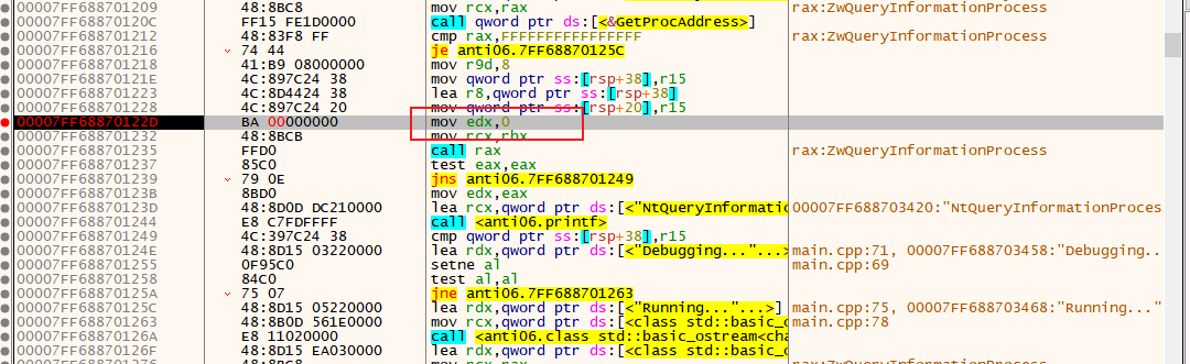 在 x64dbg 中定位到 NtQueryInformationProcess 函数的调用处,可以看到 mov edx, 7 的初始化代码,只要把这里的 7 改为无害的比如 0 就可以实现绕过