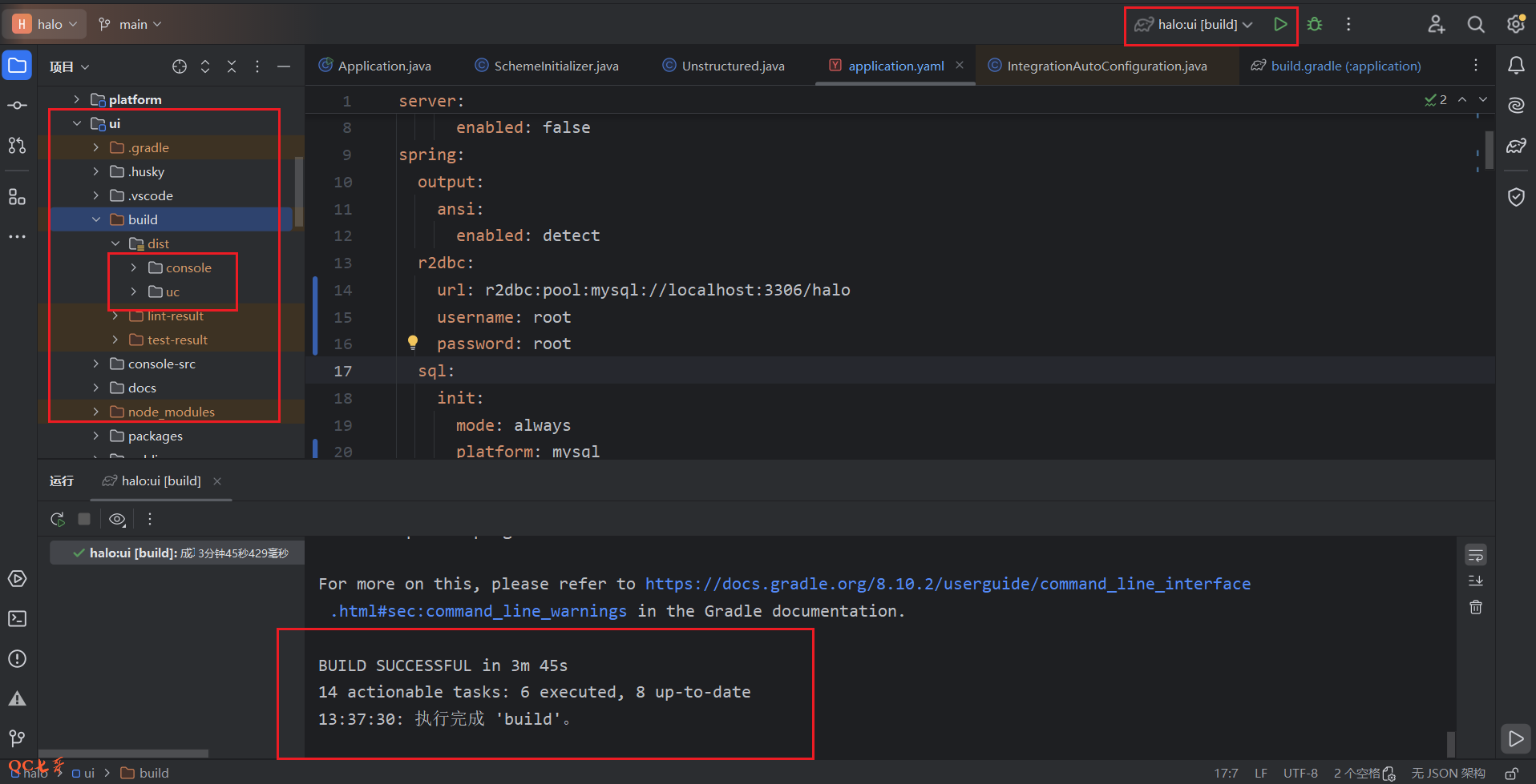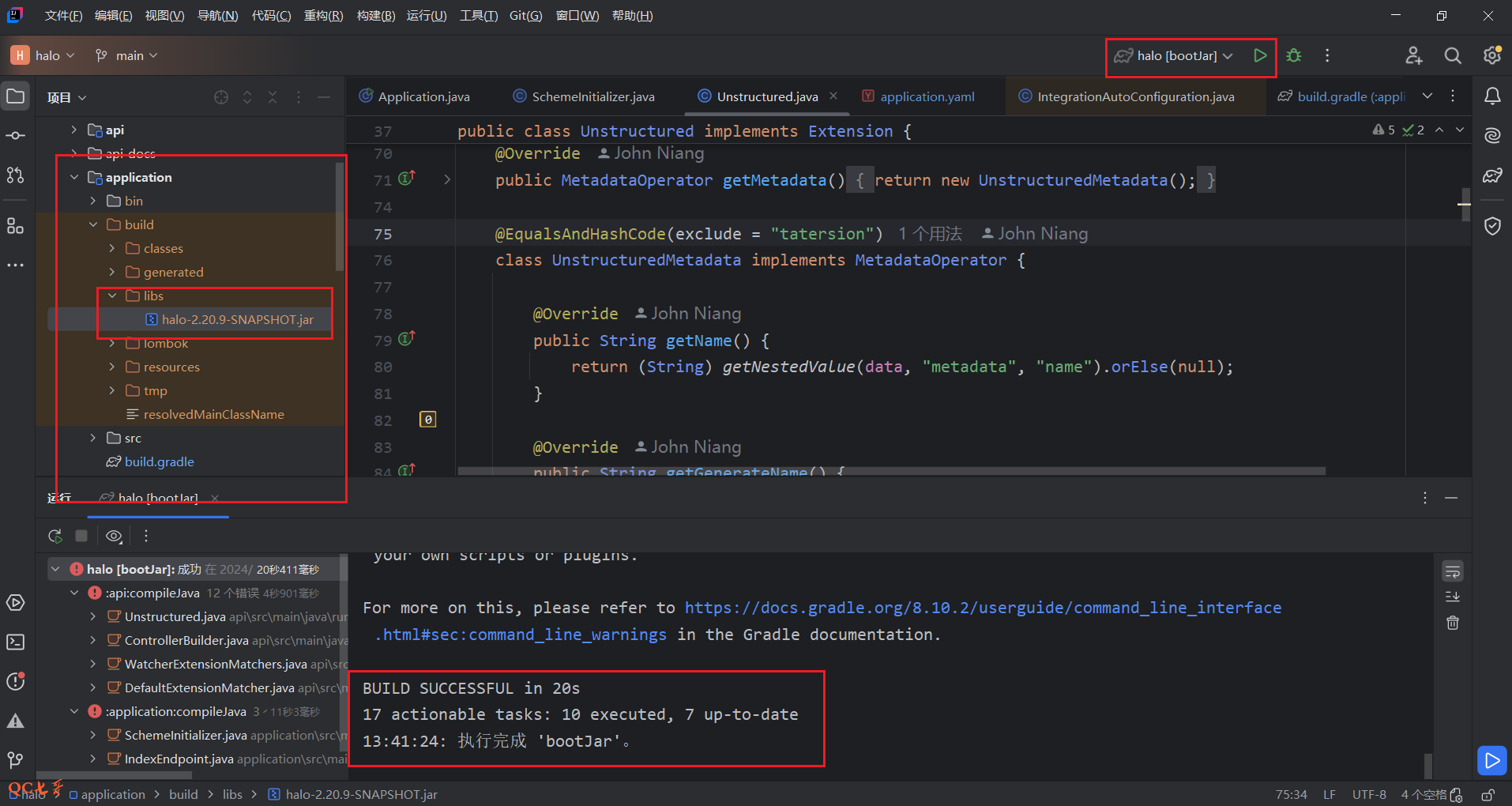 构建完毕最后下面显示信息 “BUILD SUCCESSFUL” ,编译结果输出一个 jar 文件,在目录 halo\application\build\libs 下