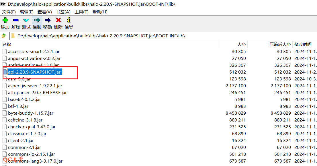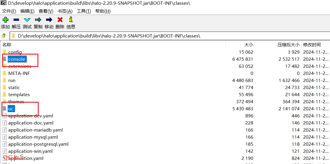 查看 jar 包内容,可以看到打包了 api 依赖包( api 包在 bootJar 编译的时候一起生成的),还有前端的两个编译结果 uc 和 console