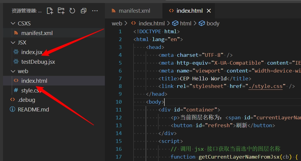 所以这里需要两套调试配置,一套调试前端的代码,一套调试 JSX 的代码,从目录结构也可以看出,web目录的是前端代码,JSX目录是 AE 引擎执行的代码