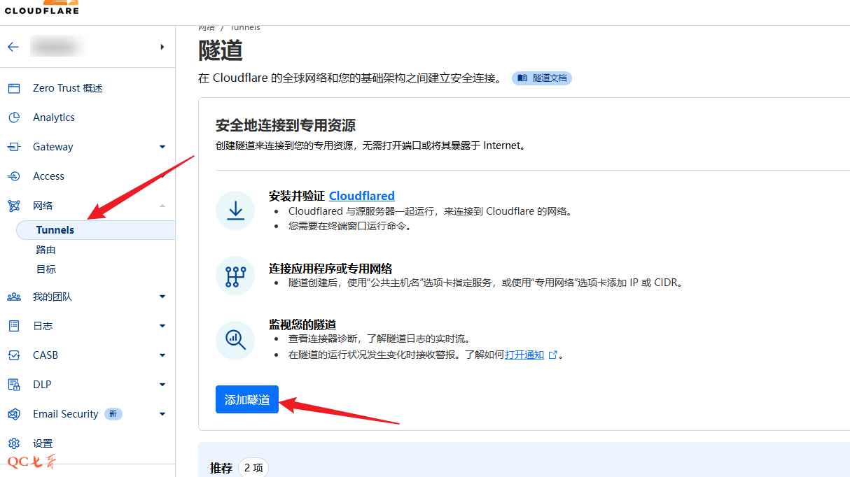 在 “Zero Trust” 页面,选择 “网络” 下的 “Tunnels”,然后在右侧中选择 “添加隧道”