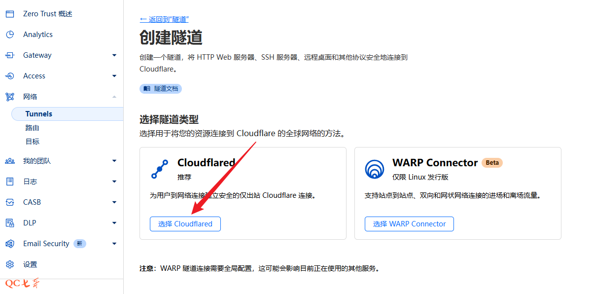 在 “添加隧道” 选择 Cloudflared
