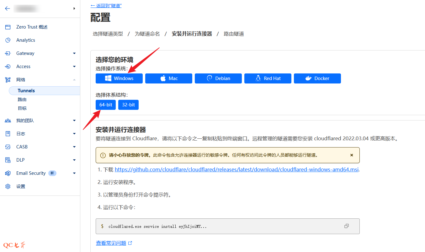 比如,我需要配置本地穿透的机器为 windows 64-bit,选择不同的环境,下方就会出现不同的配置信息