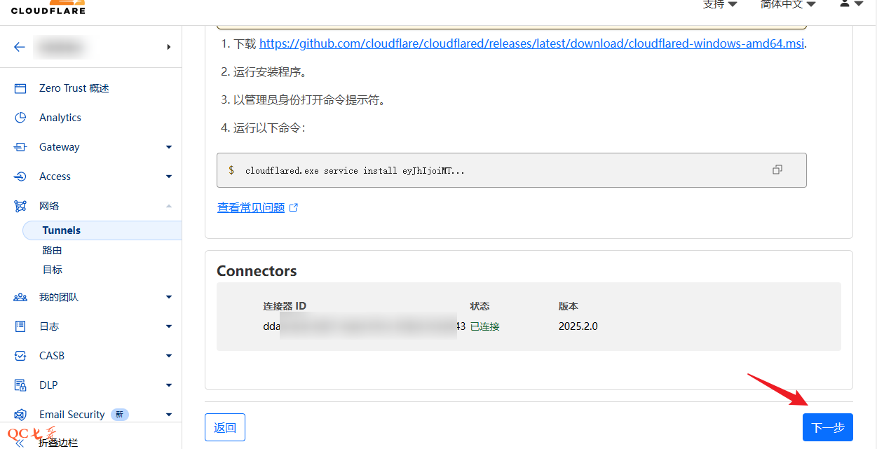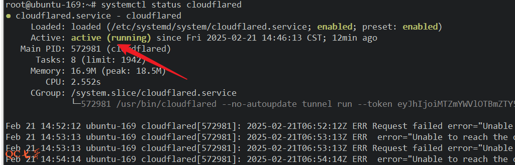 安装服务后,cloudflared 服务会自动运行,systemctl status cloudflared 查看服务状态
