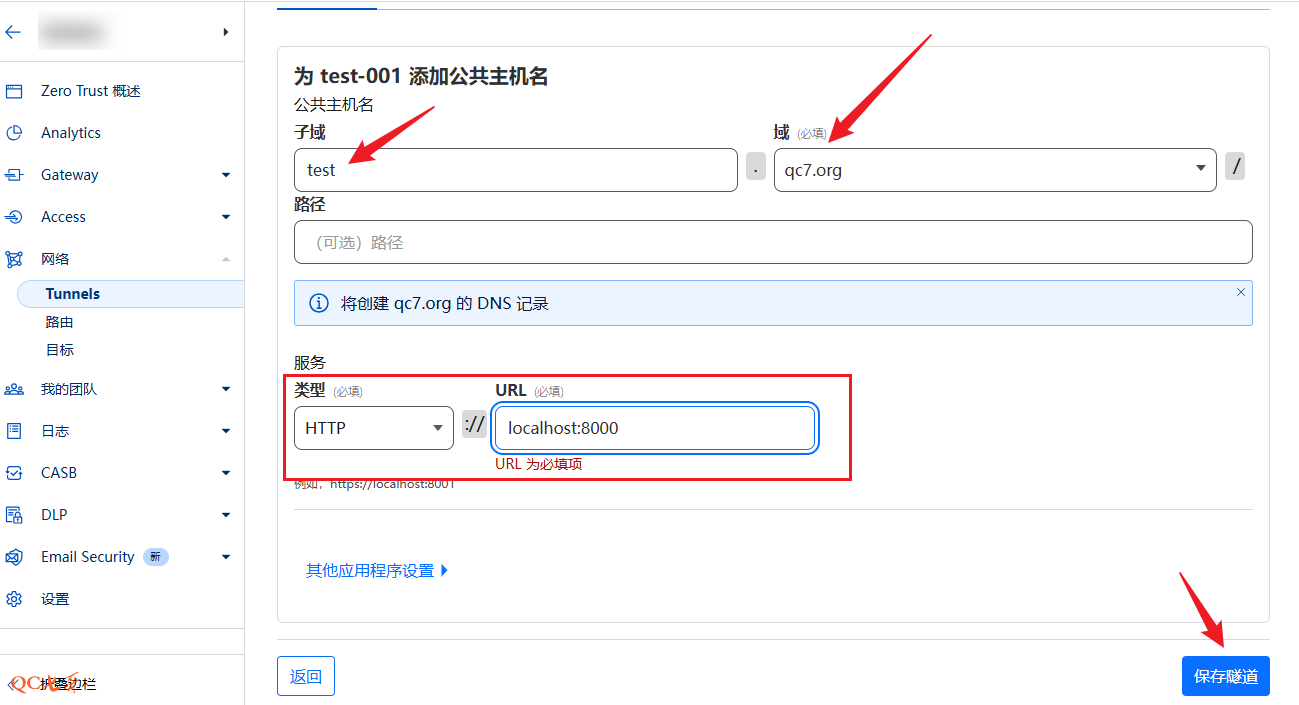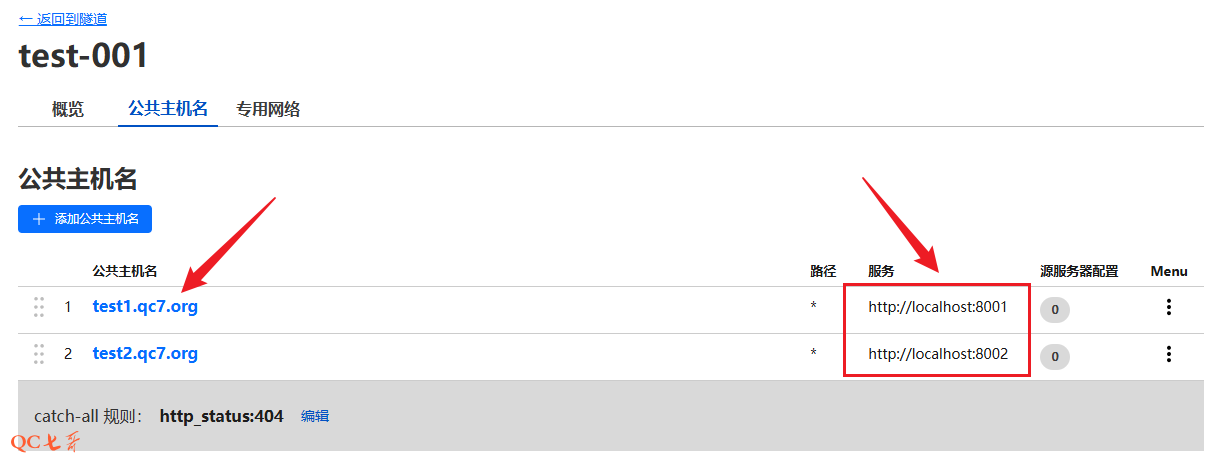 修改 cf 中前面 test-001 隧道的配置,并在 “公共主机名” 中最终为隧道创建了两条记录