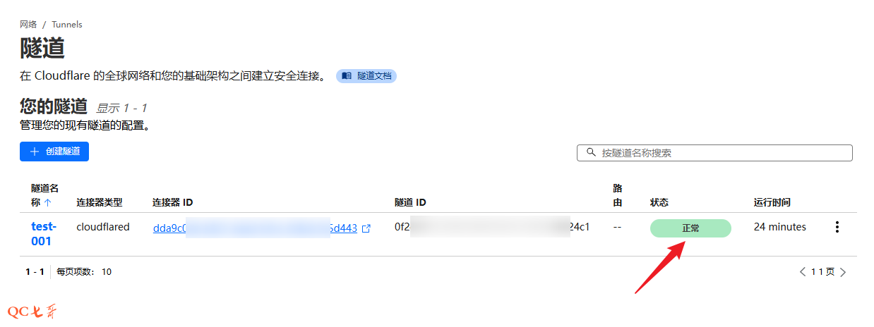 保存后,显示的隧道页面中,出现一条状态正常的隧道记录
