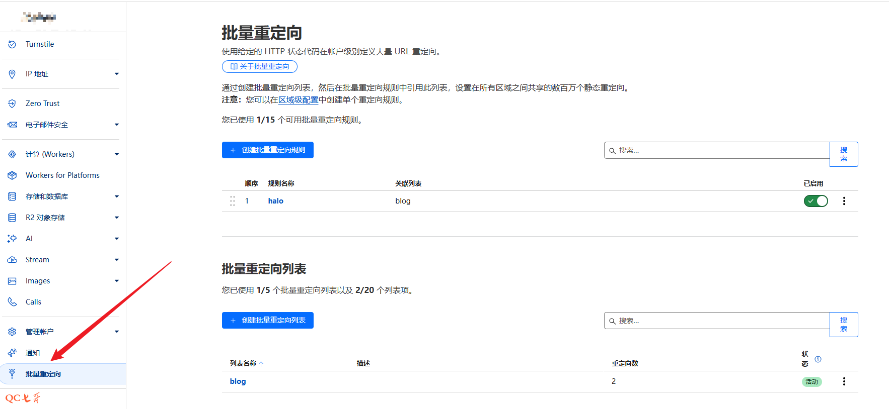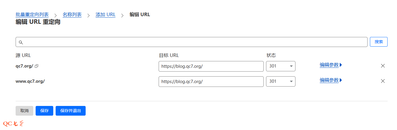 cloudflare 中支持进行重定向配置,在 “批量重定向” 添加重定向规则以及重定向列表