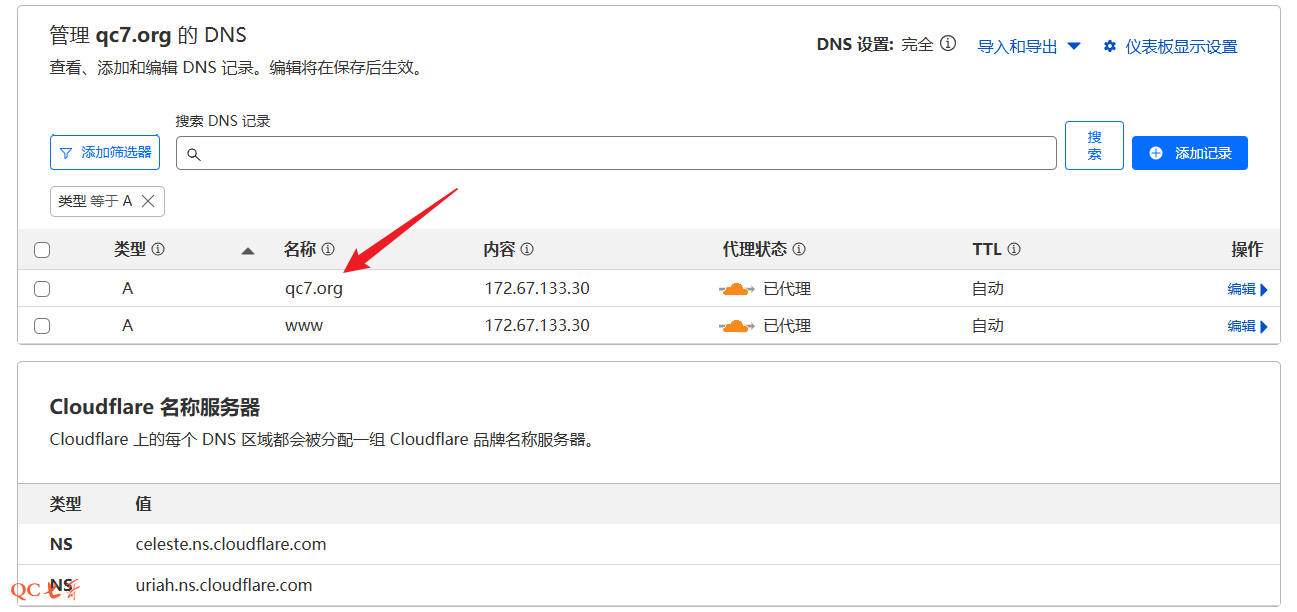 回到域名 DNS 配置页面,添加两条 DNS 记录,我这里的配置指向了任意一个 cf 的地址