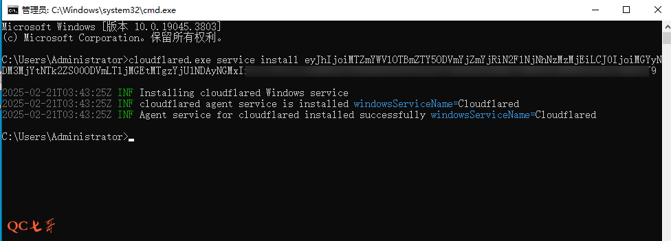 运行命令后显示, Agent service for cloudflared installed successfully 表示隧道建立成功