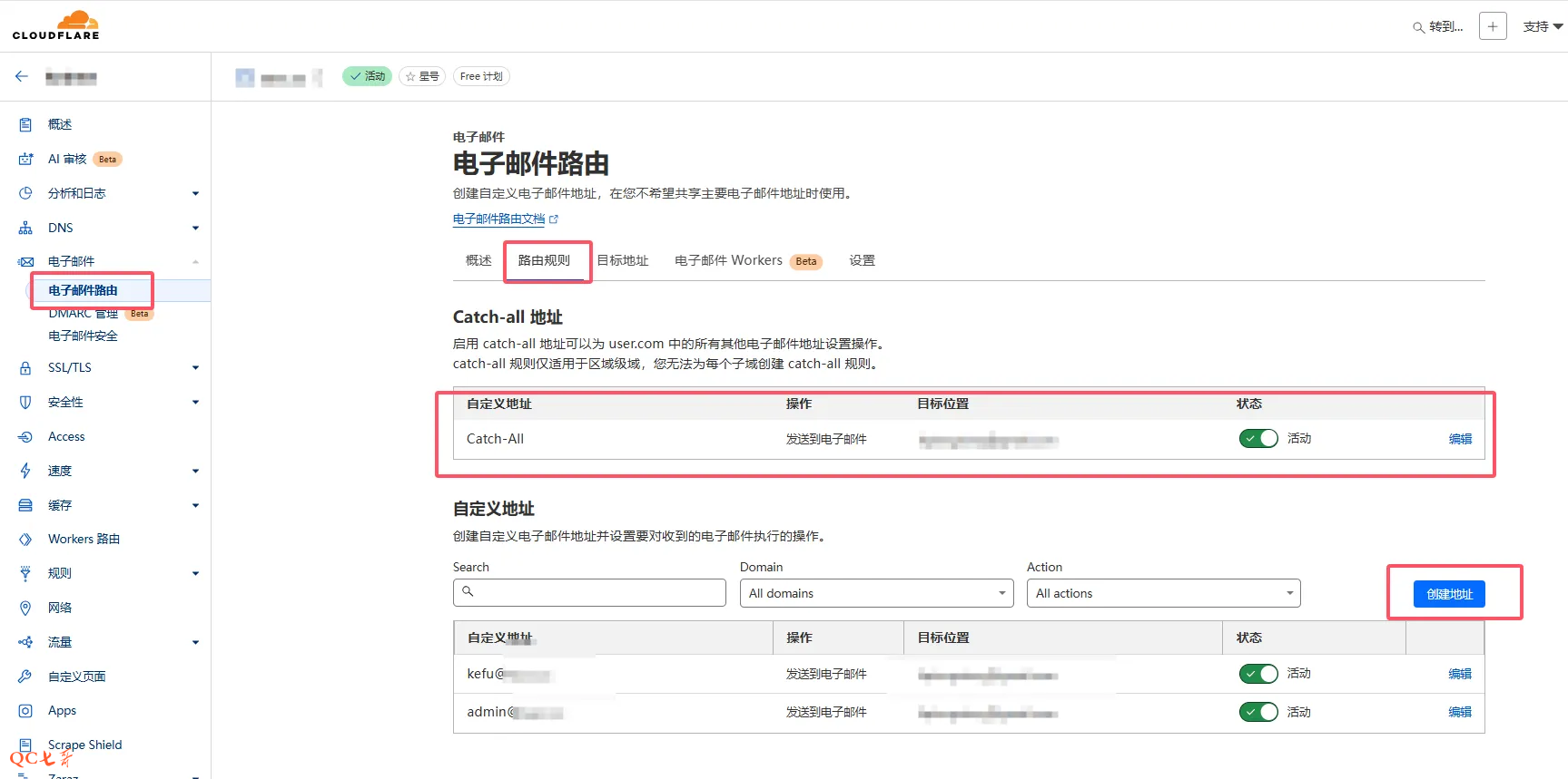 在 “电子邮件路由” 中,“路由规则” 标签页,创建你指定的邮件地址,如 admin 等,并指标目标邮件地址,以便 cf 将邮件转发到你有效的邮箱中