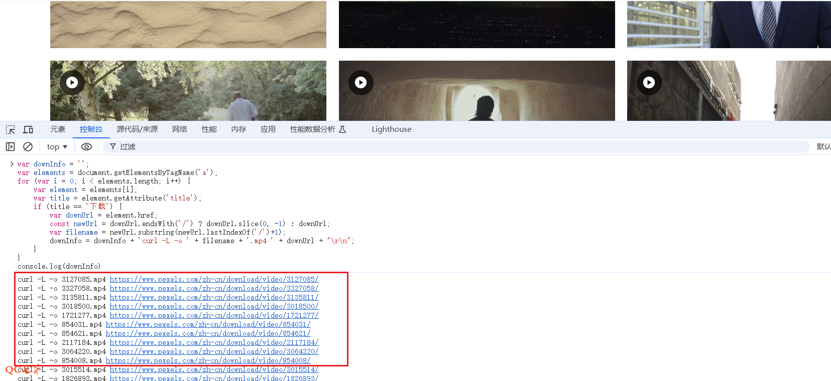 在浏览器的 console 窗口,通过脚本的方式将每一个资源的地址都提取出来,然后就可以进行批量下载