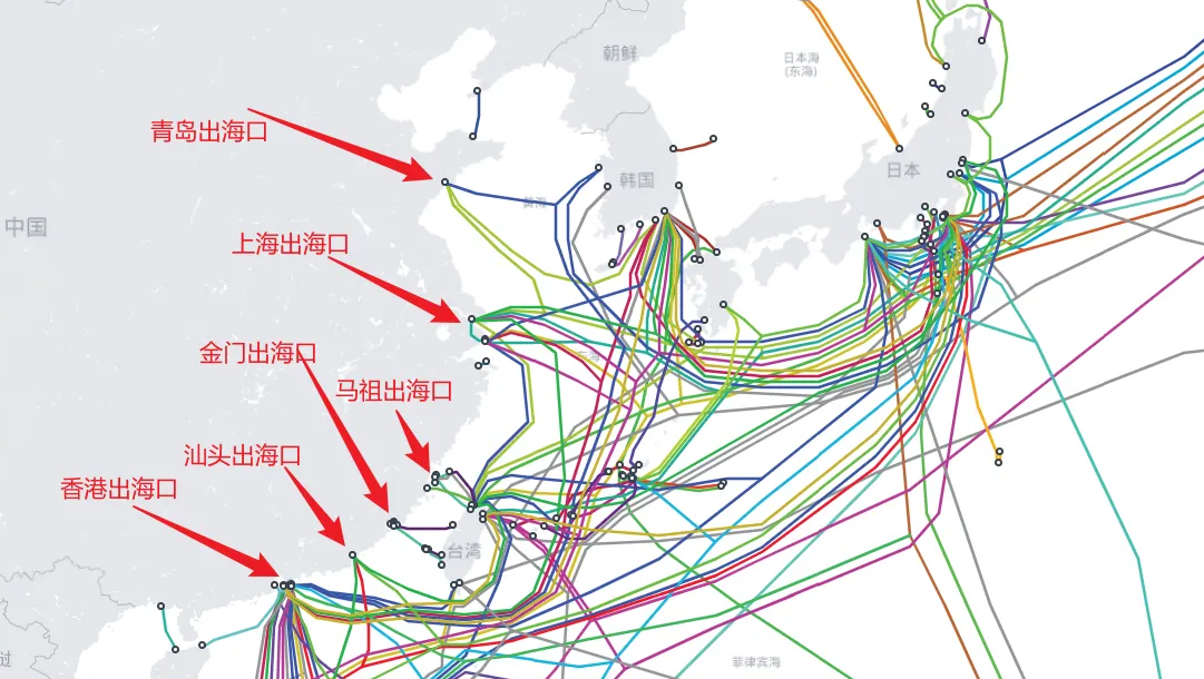远距离国际通信是通过铺设海底光缆传输的,这里有全球海底光缆的铺设情况 https://www.submarinecablemap.com/ ,大陆的海底光缆出海口主要集中在上海和香港