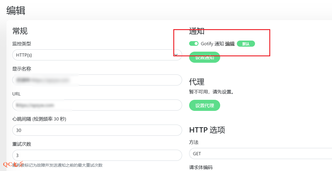 点击一个已有的监控项,点击 编辑,查看监控项的配置信息,可以发现已经自动开启了 Gotify 通知