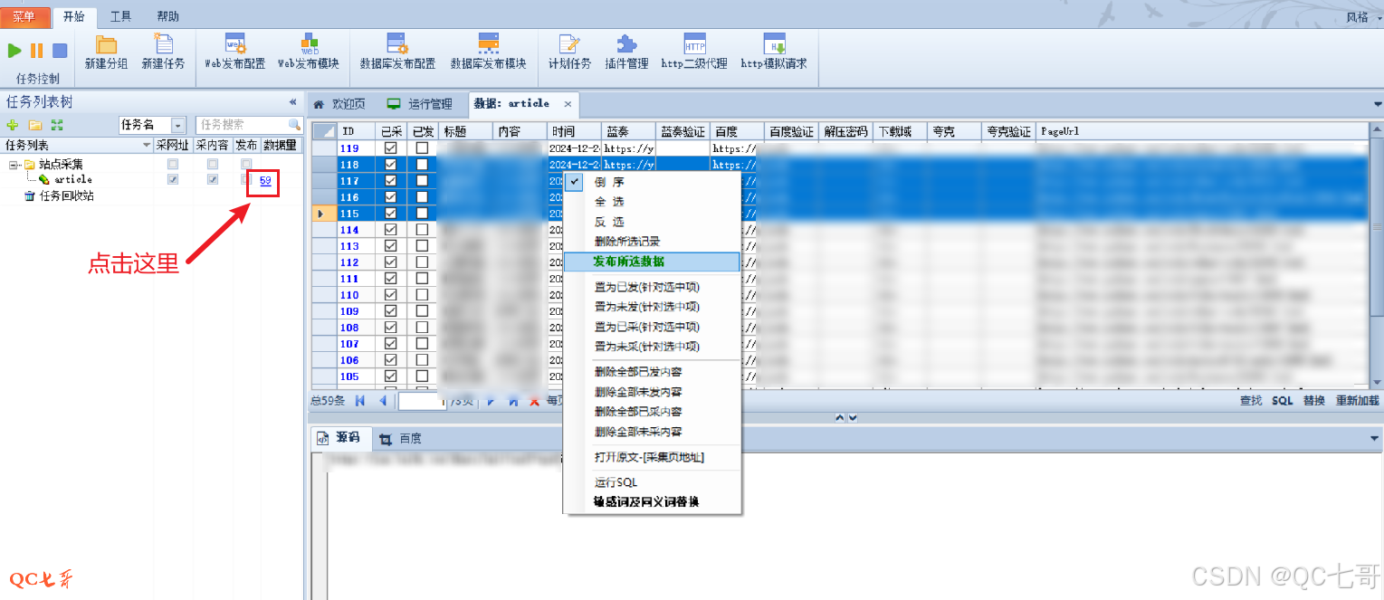 右边将会新打开一个数据页,显示刚采集到的文章列表,全选或者选择一部分文章,右键 “发布所选记录”