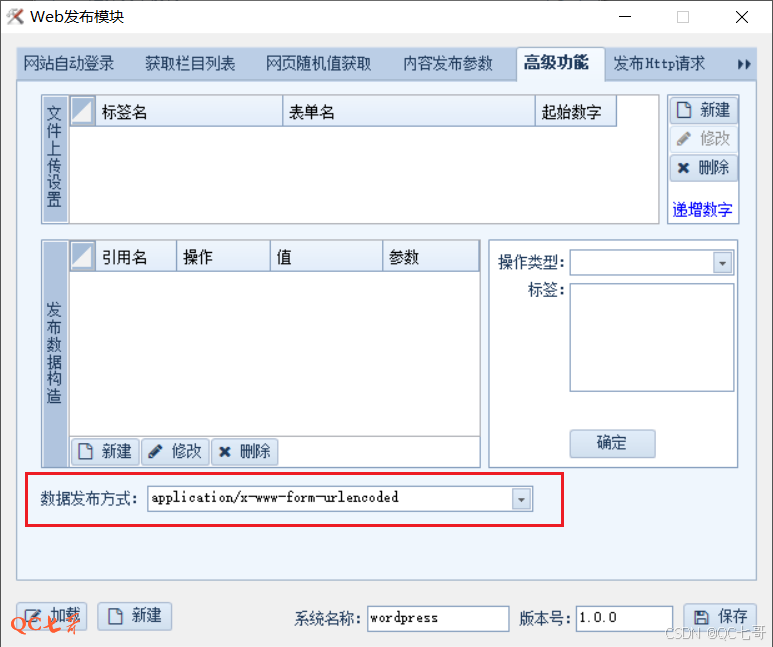述点击 4 位置的 “+” 后,弹出 “Web发布模块” 配置框,需要配置几个标签页