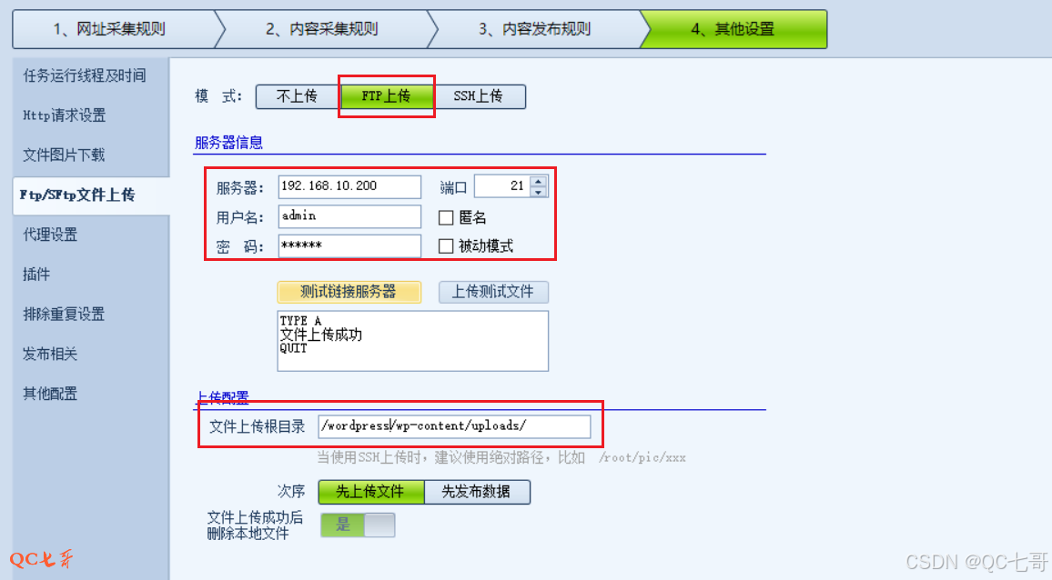 切换到 “其他设置” 界面 “Ftp/SFtp文件上传” 中,在这里配置 FTP 如下( wordpress 机器需要先开通 ftp 服务)