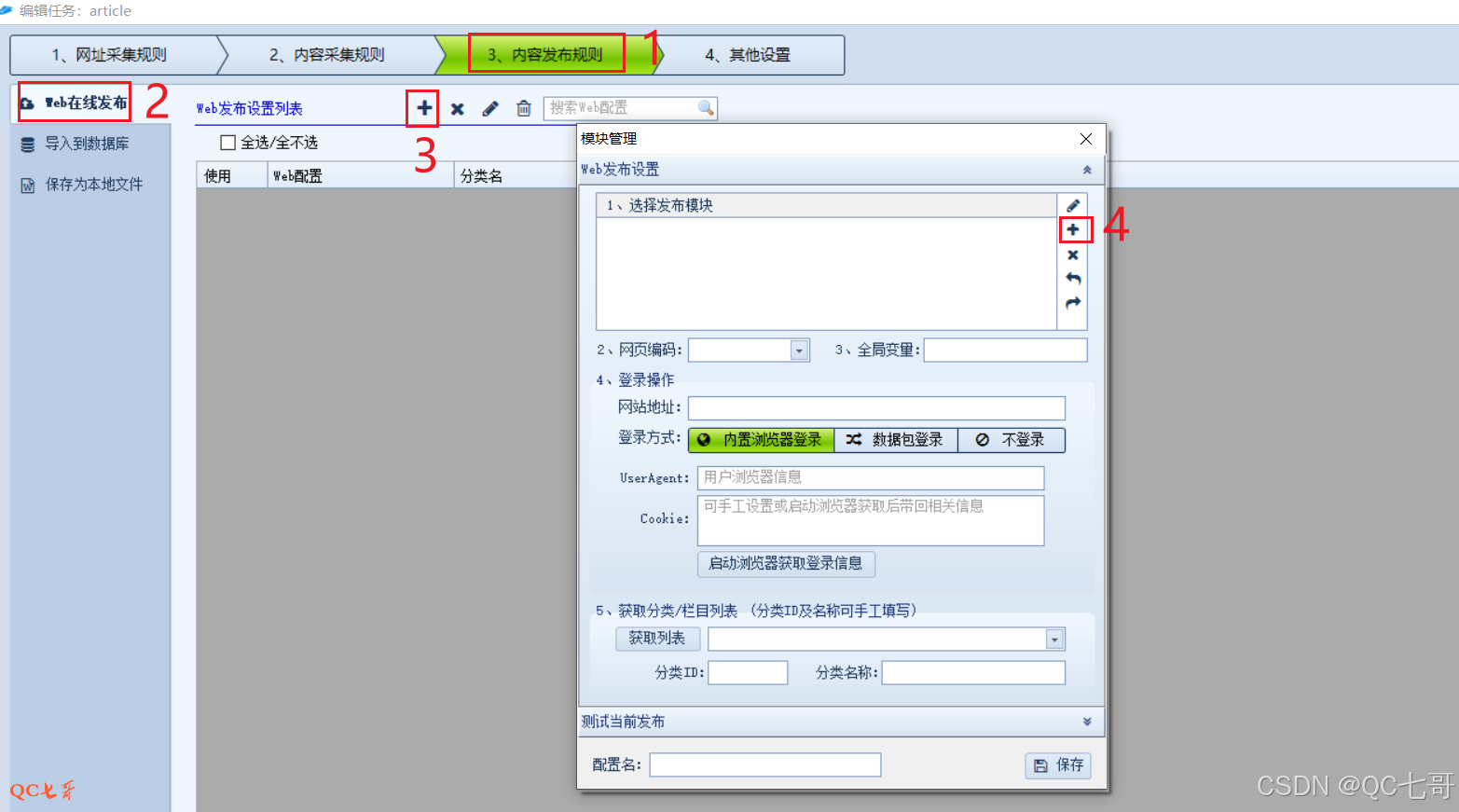 上面两个步骤配置好之后,回到火车头工具上面来,选择 “Web在线发布”,点击 “+” (标号 3 )增加发布设置