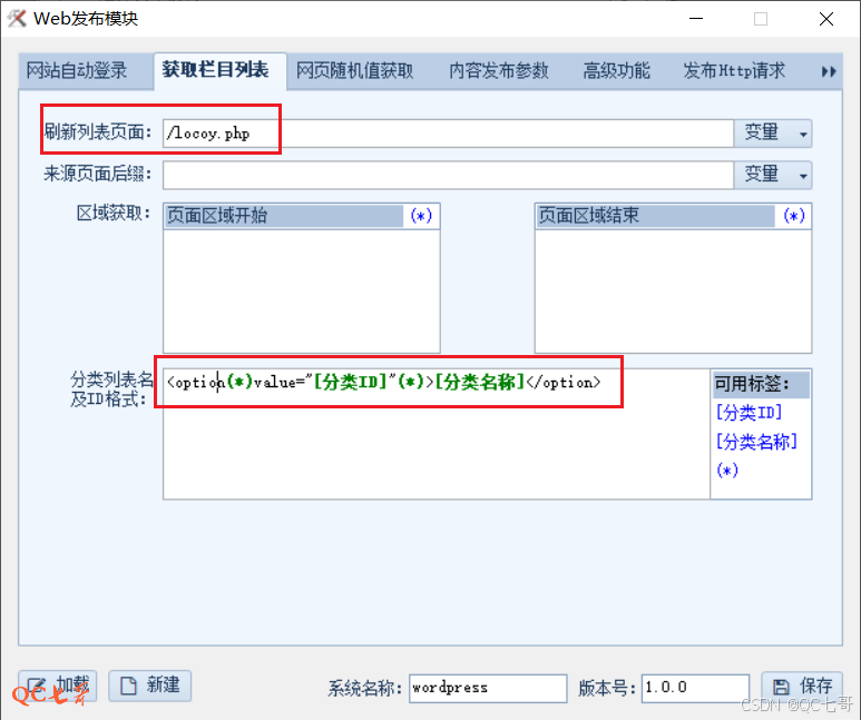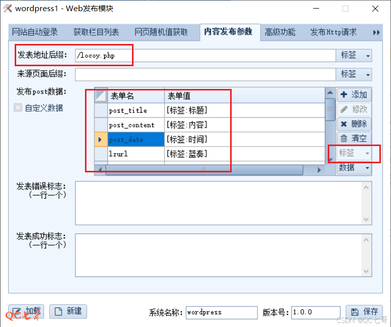 表单值在编辑状态下,可以通过右侧的标签来设置,表单名需要和 locoy.php 文件内的 $_POST 变量一致