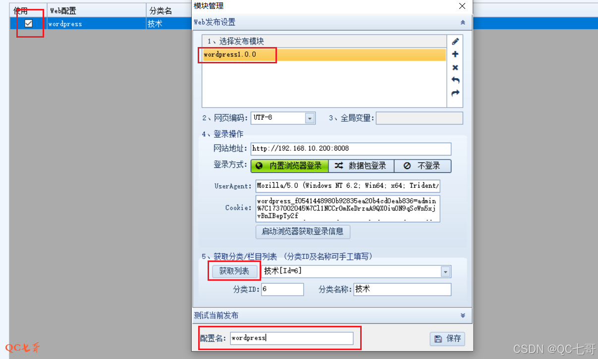 还有 UserAgent 和登录 Cookie,然后点击下方的 “获取列表” 并选一个类别作为当前发布文章的类别