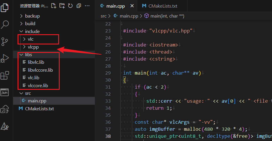 inlude\vlcpp 为前面提到的 libvlcpp 的头文件,include\vlc 和 libs 为 sdk 的部分,main.cpp 为来自 libvlcpp 中的示例代码