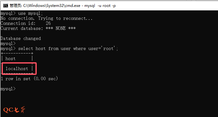 进入 mysql 数据库,并查看 root 用户的配置主机,当前默认只能 localhost 进行连接