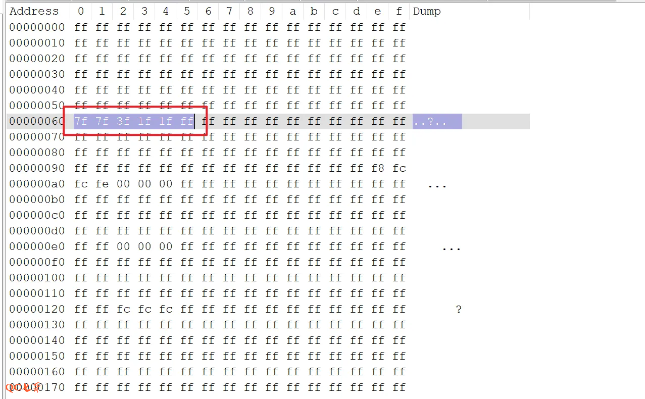 其中 08 单元的 df 在图形上表示为左侧第一个有值的列,从上往下依次为低位到高位,写成二进制为 11011111
