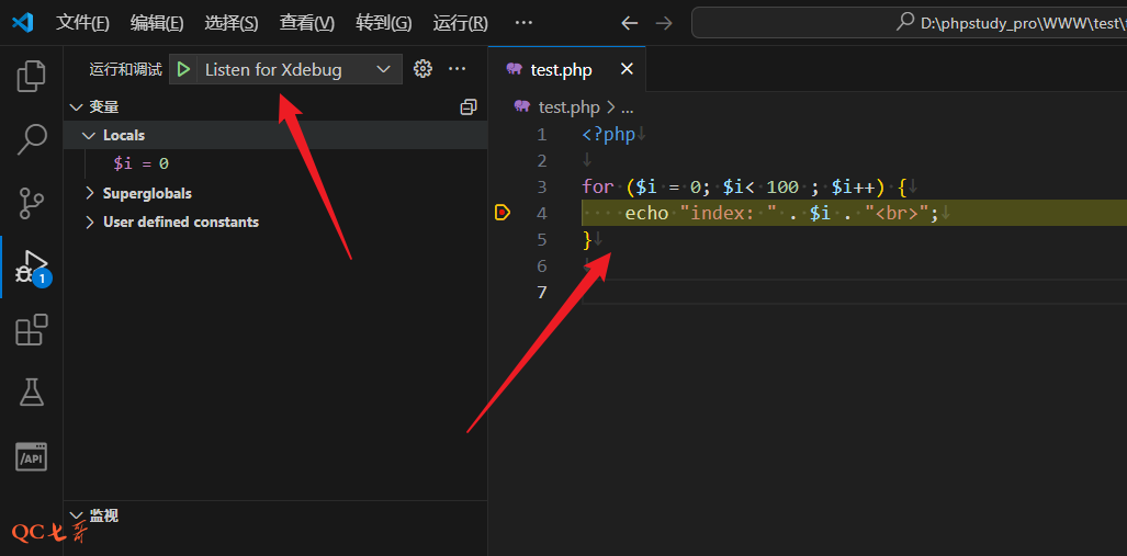 回到 vscode 中,点击 Listen for Xdebug 启动,然后浏览器中访问 http://localhost/test.php