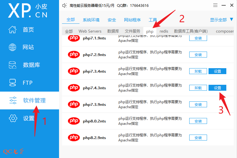 小皮中选中要调试的 php 版本,这里配置 7.4.3 版本的