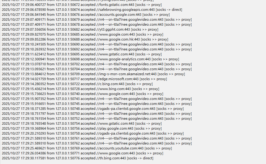 这时候如果没问题的话,访问 google.com 以及 youtube.com 等一些被墙站点,应该是可以正常的,v2ray 界面中日志显示如下