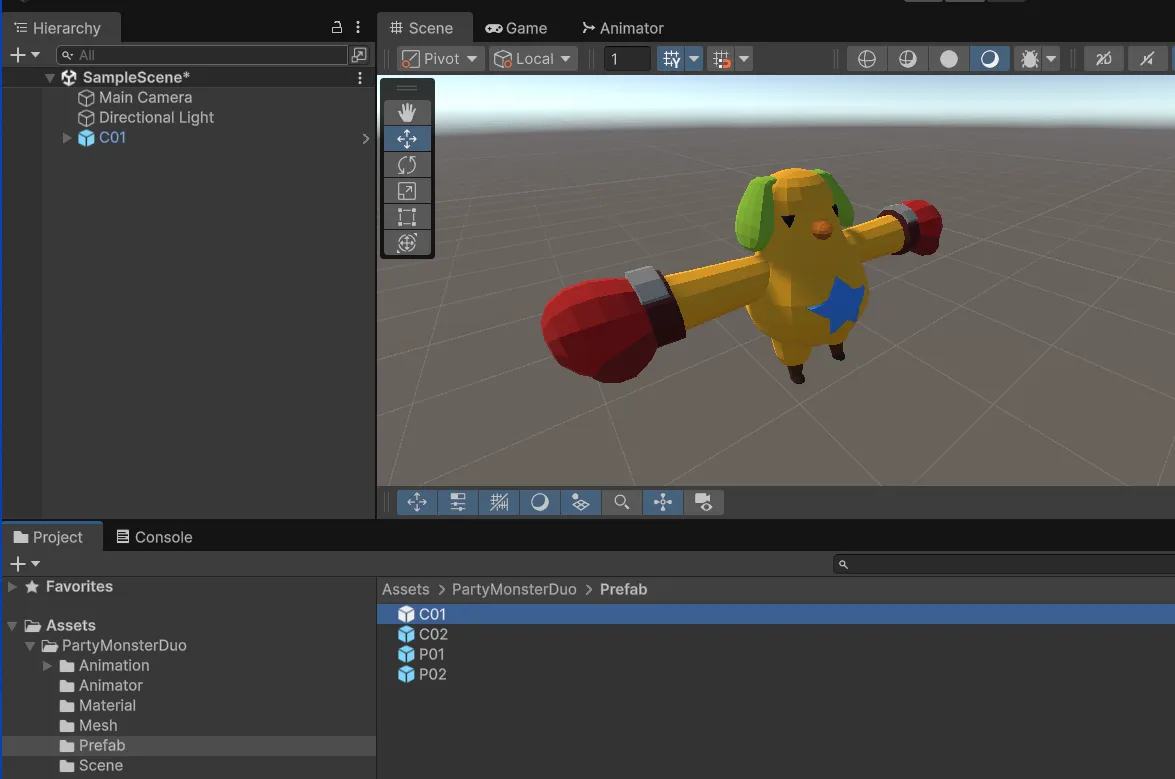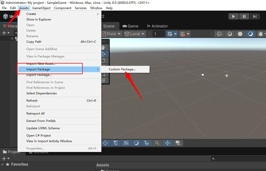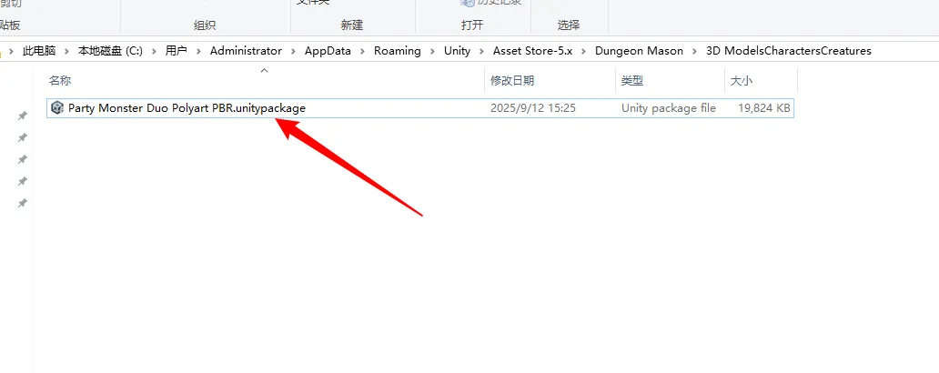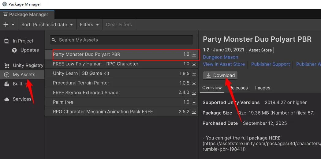 新建项目后,在 Assets 菜单下,将刚刚下载的 “Party Monster Duo Polyart PBR.unitypackage” 资源包进行导入