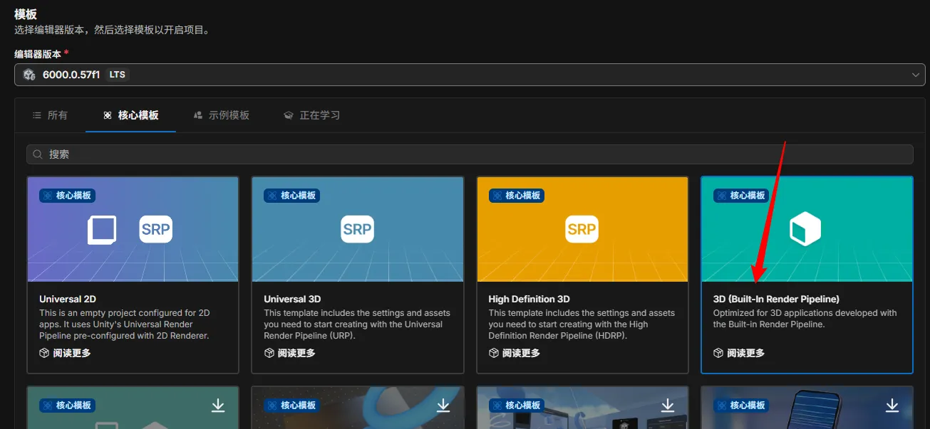 所以新建的时候,选择 3D (Built-In Render Pipeline),然后创建项目,这个模板如果没下载的话,需要先下载才能进行选择
