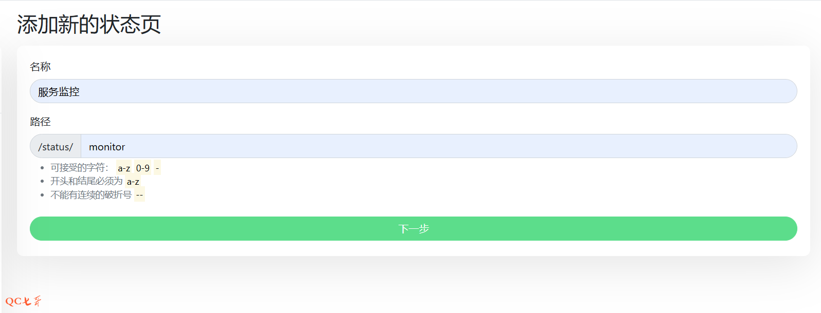 比如这里添加的一个名为 “服务监控” 的状态页 status/monitor