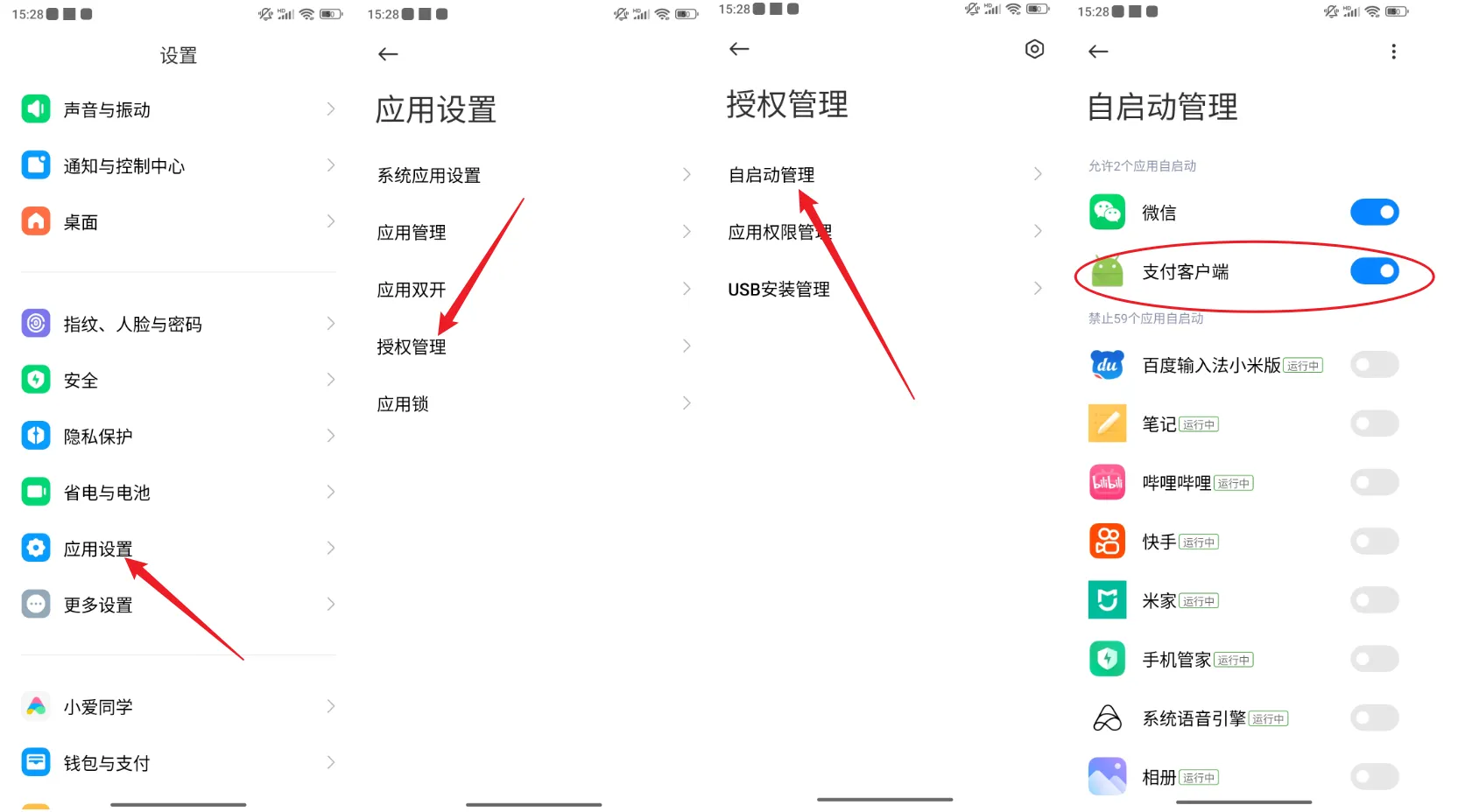 在 设置 => 应用设置 => 授权管理 => 自启动管理 中, 将支付客户端设置为自启动