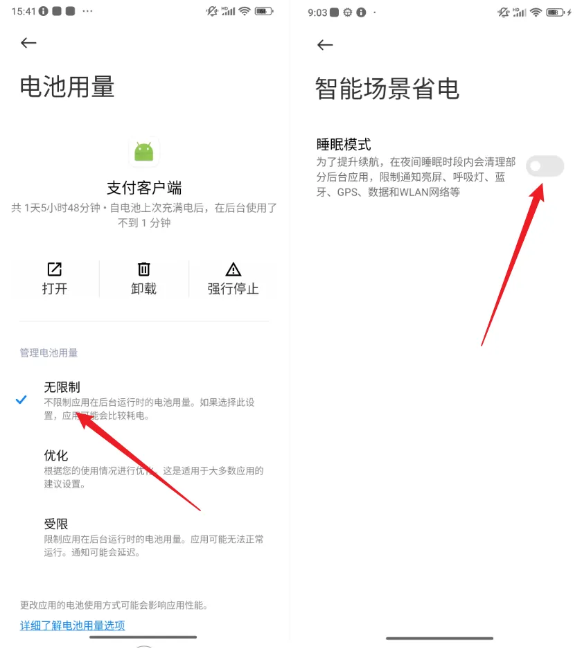 将应用设置为电量无限制模式,并且关闭电池中的智能场景省电,在 设置 中的 电池与省电 下还有很多的配置,能关闭的尽量关闭,省电会让系统杀进程