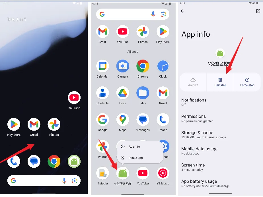 空白处上滑,显示安装的 app 应用列表,点击支付应用3秒钟,弹出应用的菜单,点击 “app info”,在显示的应用页面上点击 “uninstall” 进行卸载应用