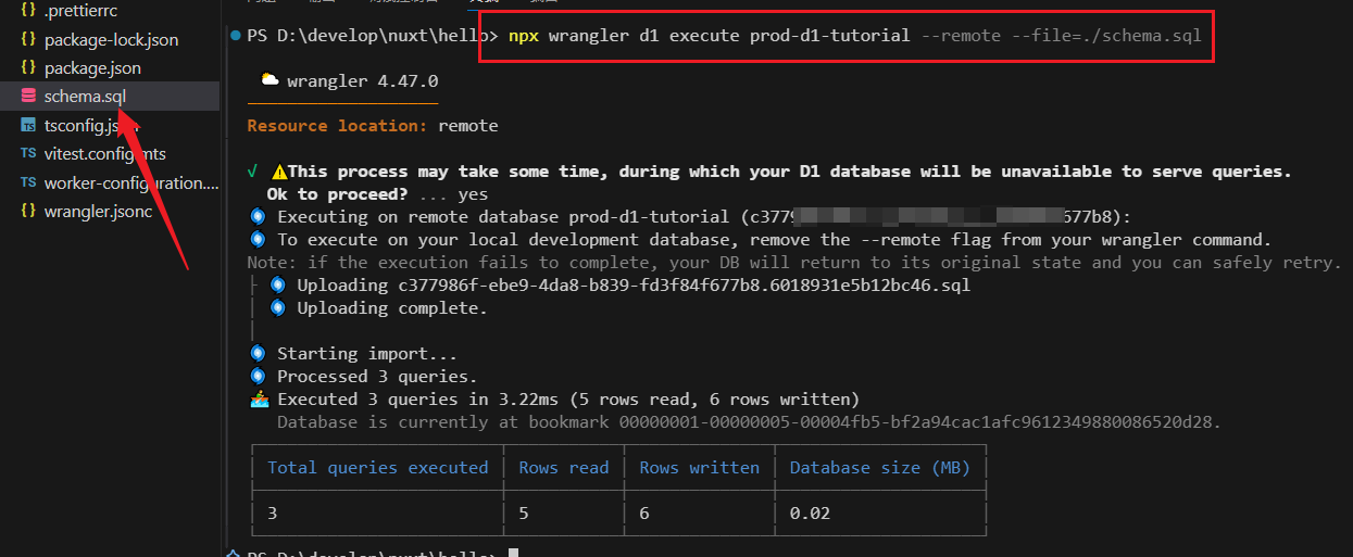 将脚本保存为 schema.sql,然后运行以下命令,这里指示为 --remote 表示在远程运行,如果本地运行,则使用 --local