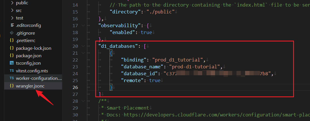 通过以下命令创建一个类型为 d1 名为 prod-d1-tutorial 的数据库,前面已经完成授权,这里将在 cf 中创建数据库,并将配置添加到 wrangler.jsonc 文件中