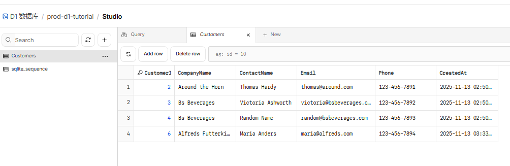 npx wrangler d1 execute prod-d1-tutorial --remote --command="SELECT * FROM Customers"`