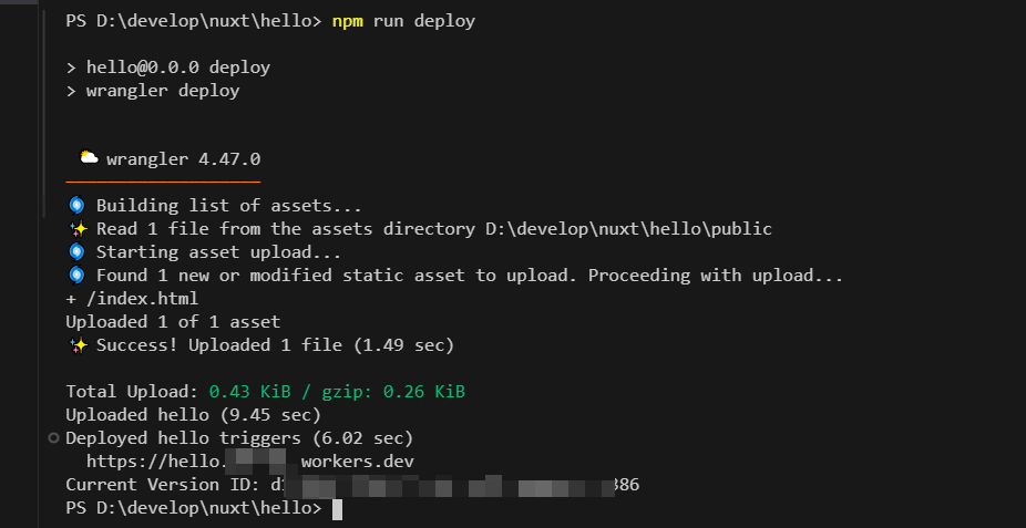 发布显示的信息如下,也可以通过日志中提示的域名进行访问 https://hello.?????.workers.dev/,这和正常的 web 服务没任何区别,还能自行绑定个人域名